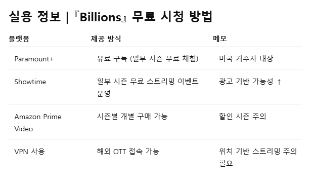 『Billions』의 핵심은 "정의와 권력의 타협점"을 치밀하게 풀어낸 대사, 연출, 그리고 등장인물입니다. OTT 트렌드 변화와 함께 무료 시청 기회가 늘어난 지금, 다시 정주행하기 좋은 타이밍이죠.