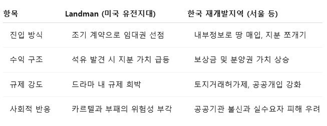 ✅ "Landman (랜드맨)" 유전 계약 vs 한국 재개발지역 투기 비교표