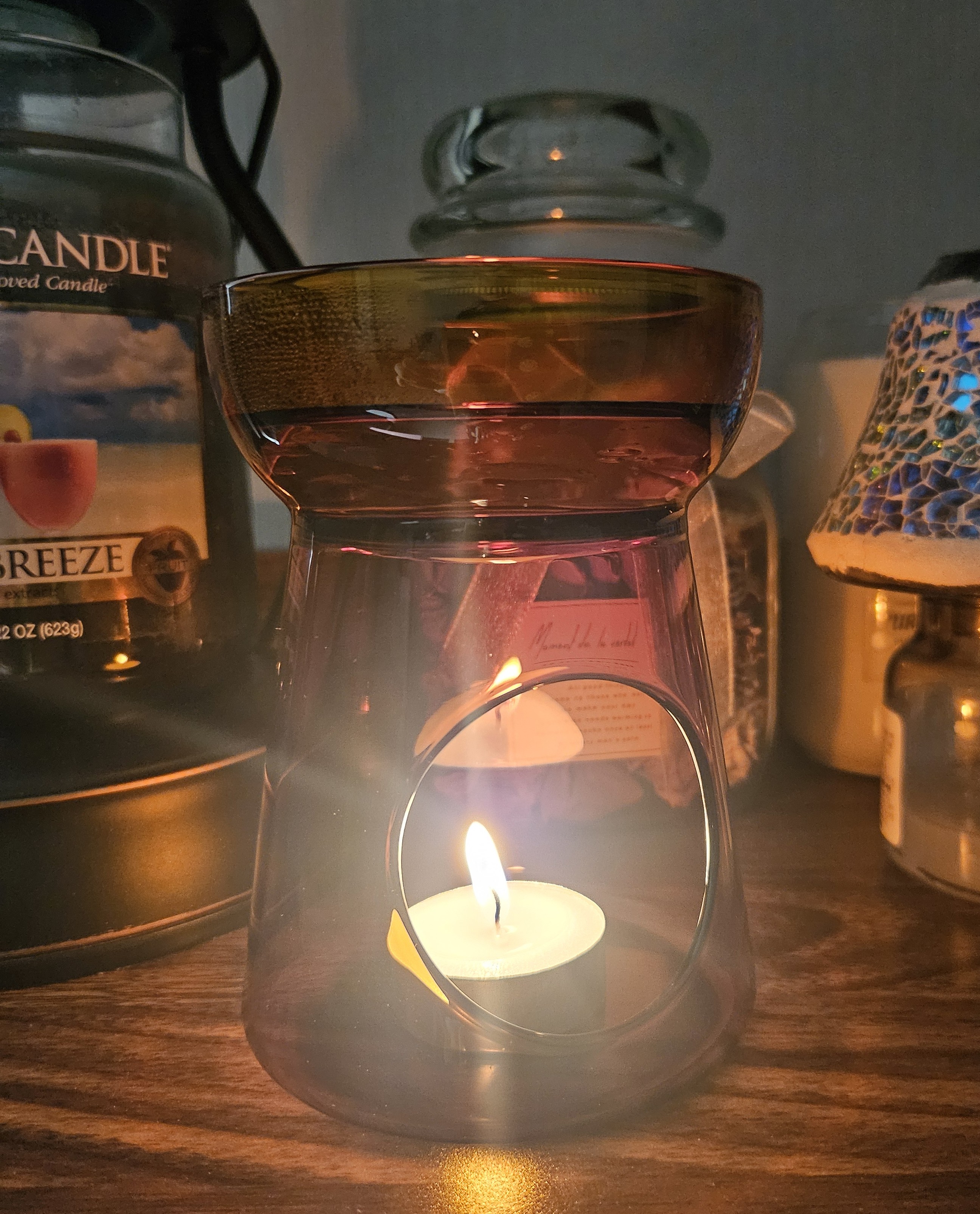 작은 티라이트 불빛이 유리 안에서 퍼지면서 무드등 역할까지 톡톡히 해요.
