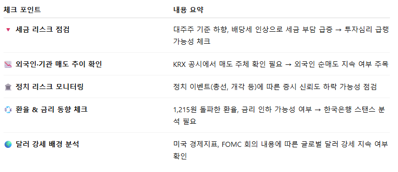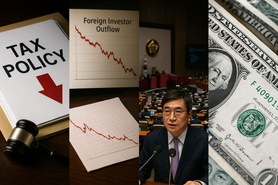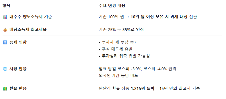 🔸 세제 개편 → 투자심리 악화 → 외국인 매도 → 환율 상승