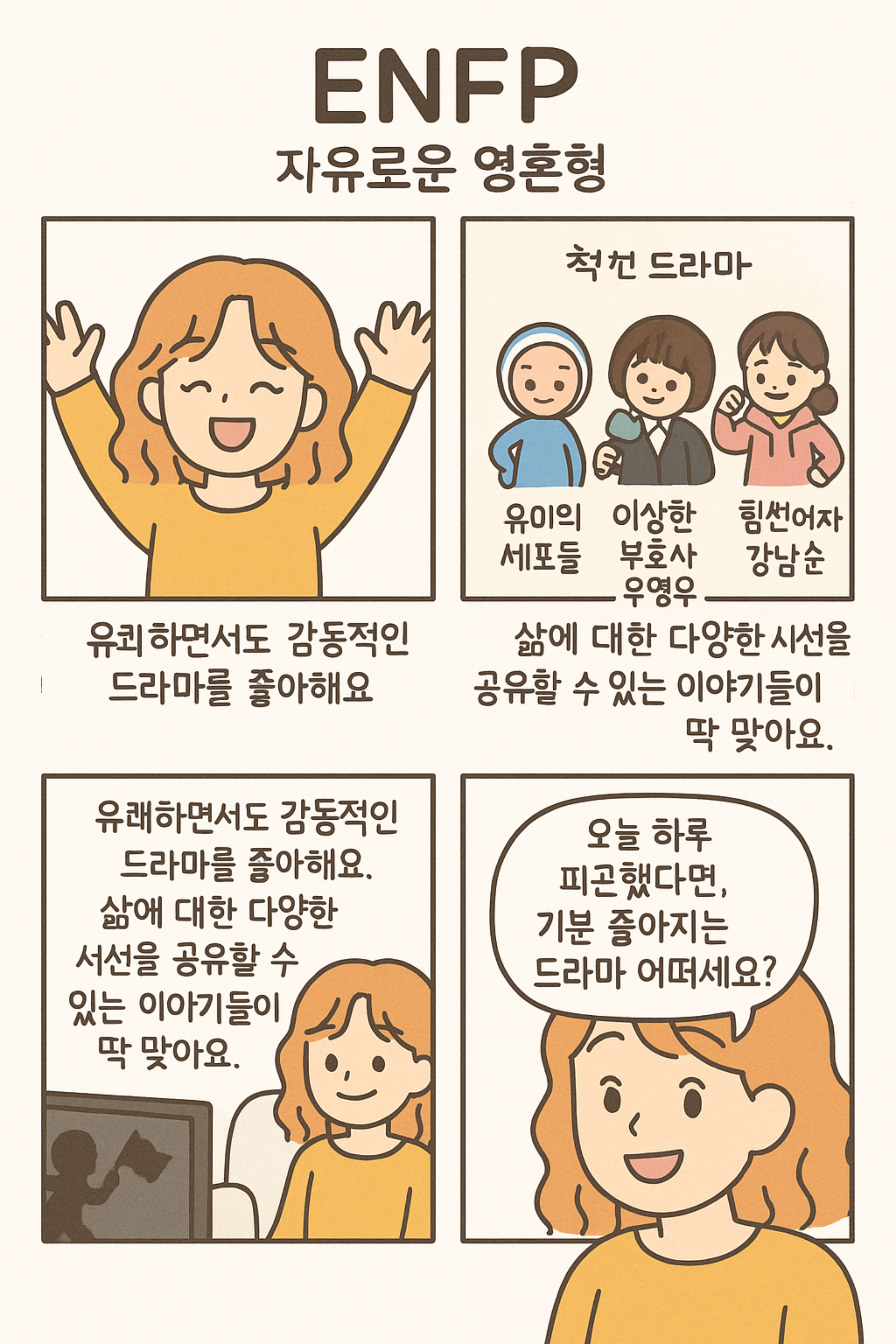 💬 여러분의 MBTI 유형과 즐겨보는 드라마가 궁금해요! 댓글로 공유해주세요.