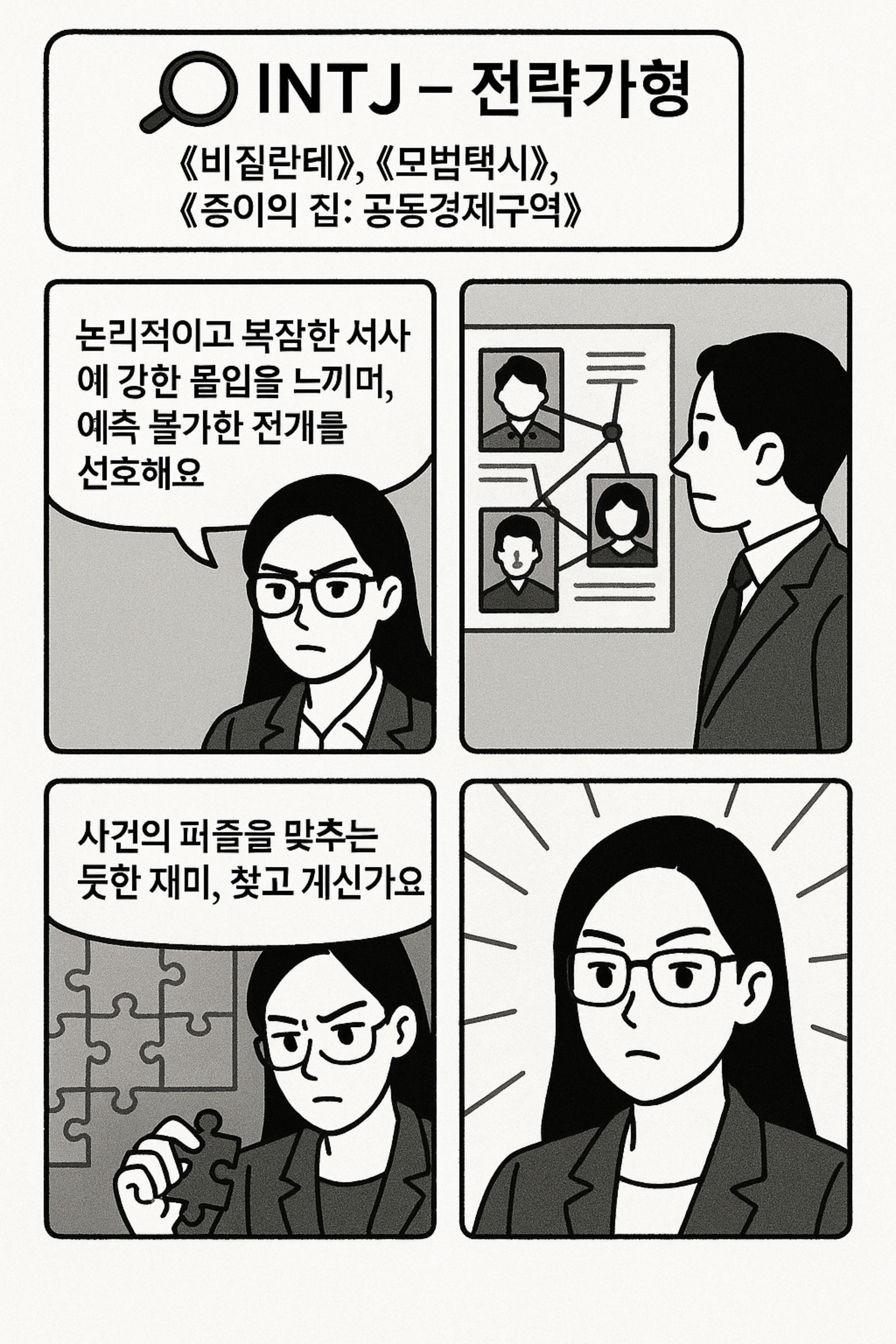 ▪️ 특징: 논리적이고 복잡한 서사에 강한 몰입을 느끼며, 예측 불가한 전개를 선호해요.