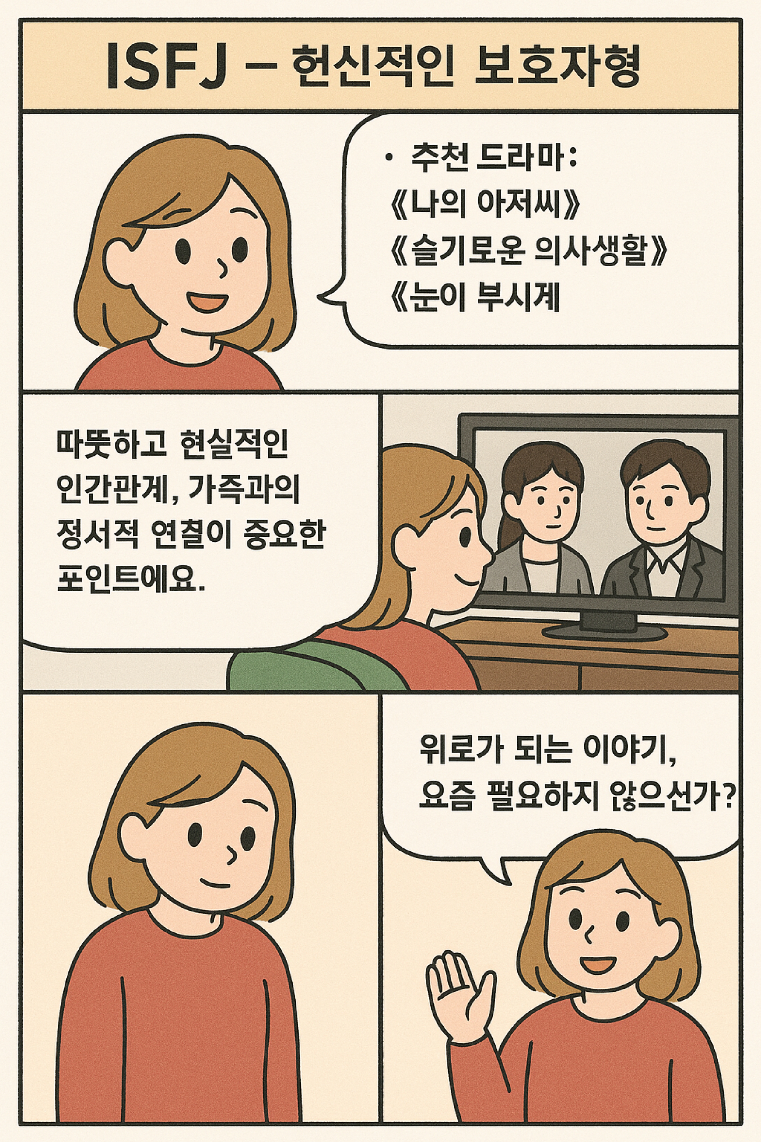 | ISTJ / ISFJ | 가족극, 실화 기반 | 안정적이고 따뜻한 메시지 |