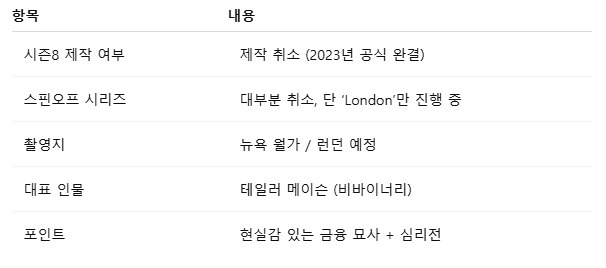 이는 드라마 내 주요 스토리라인이 시즌7에서 마무리되었기 때문인데요. 투자 세계의 권력 다툼과 복잡한 인간관계를 다룬 이 드라마는 사실상 종결된 구조로 시즌7을 마무리했습니다.