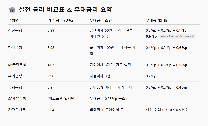 - 은행별 조건 비교 : 만기, 비대면 여부, 우대금리 활용