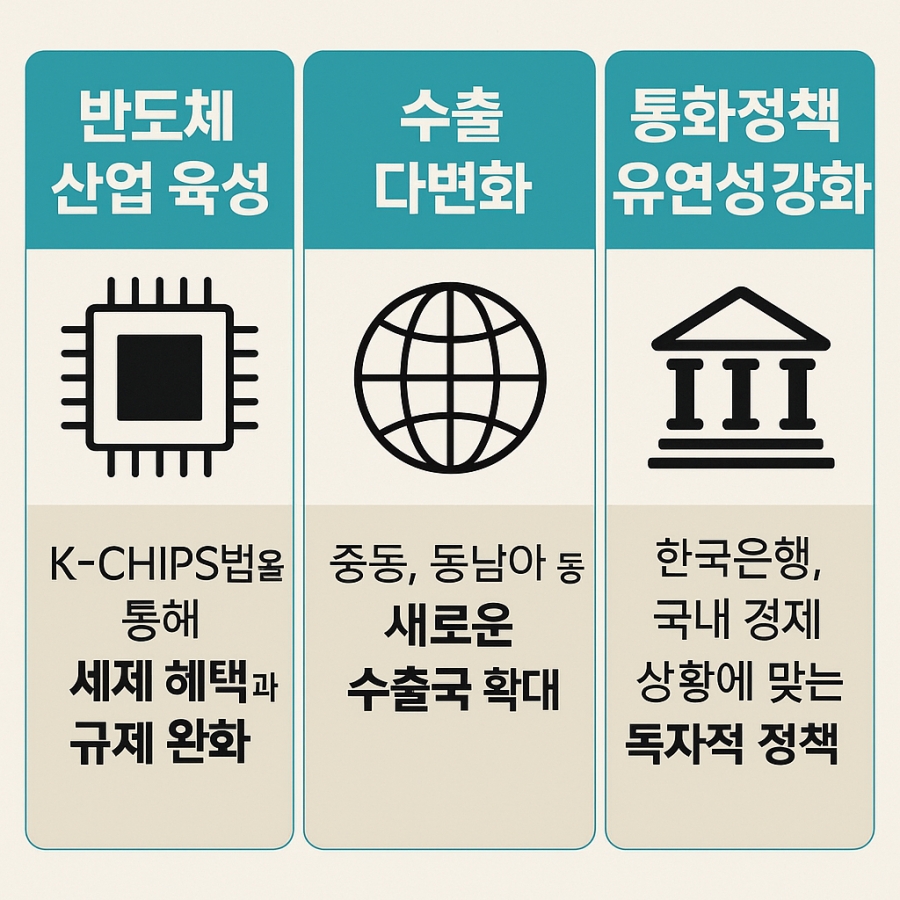 ▪️ 반도체 산업 육성: K-CHIPS법을 통해 세제 혜택과 규제 완화를 제공하며, 반도체 산업을 전략산업으로 보호하고 있습니다.