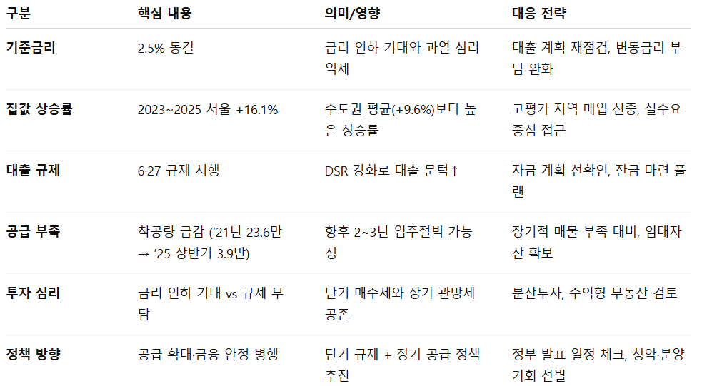 2025년 서울 부동산 과열과 기준금리 2.5% 동결, 대출 규제·공급 부족·투자 전략까지 한눈에 정리한 실전 가이드.
